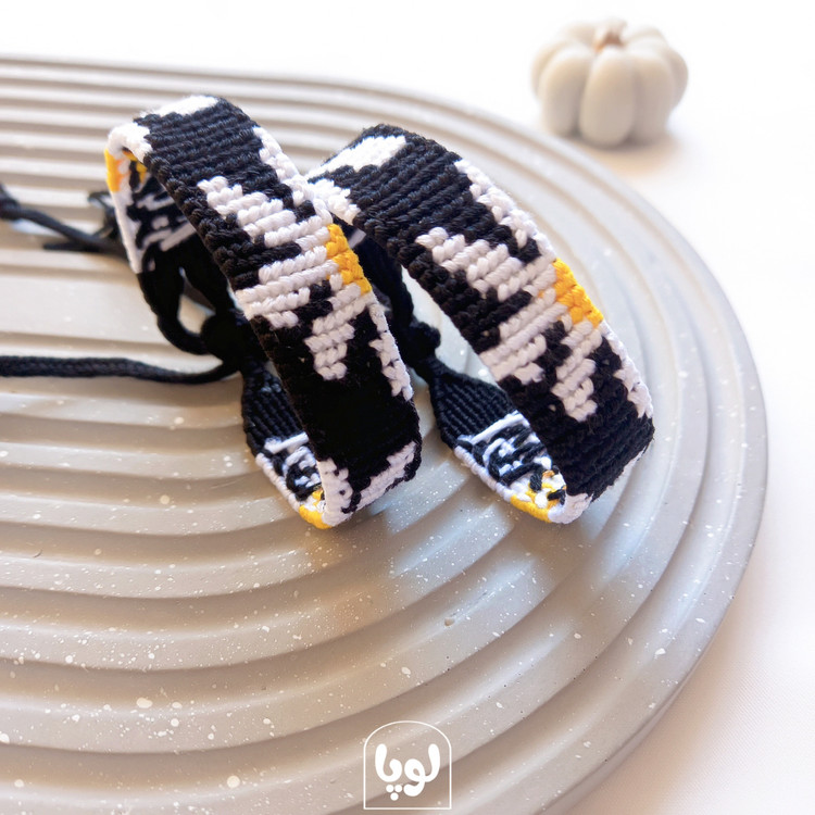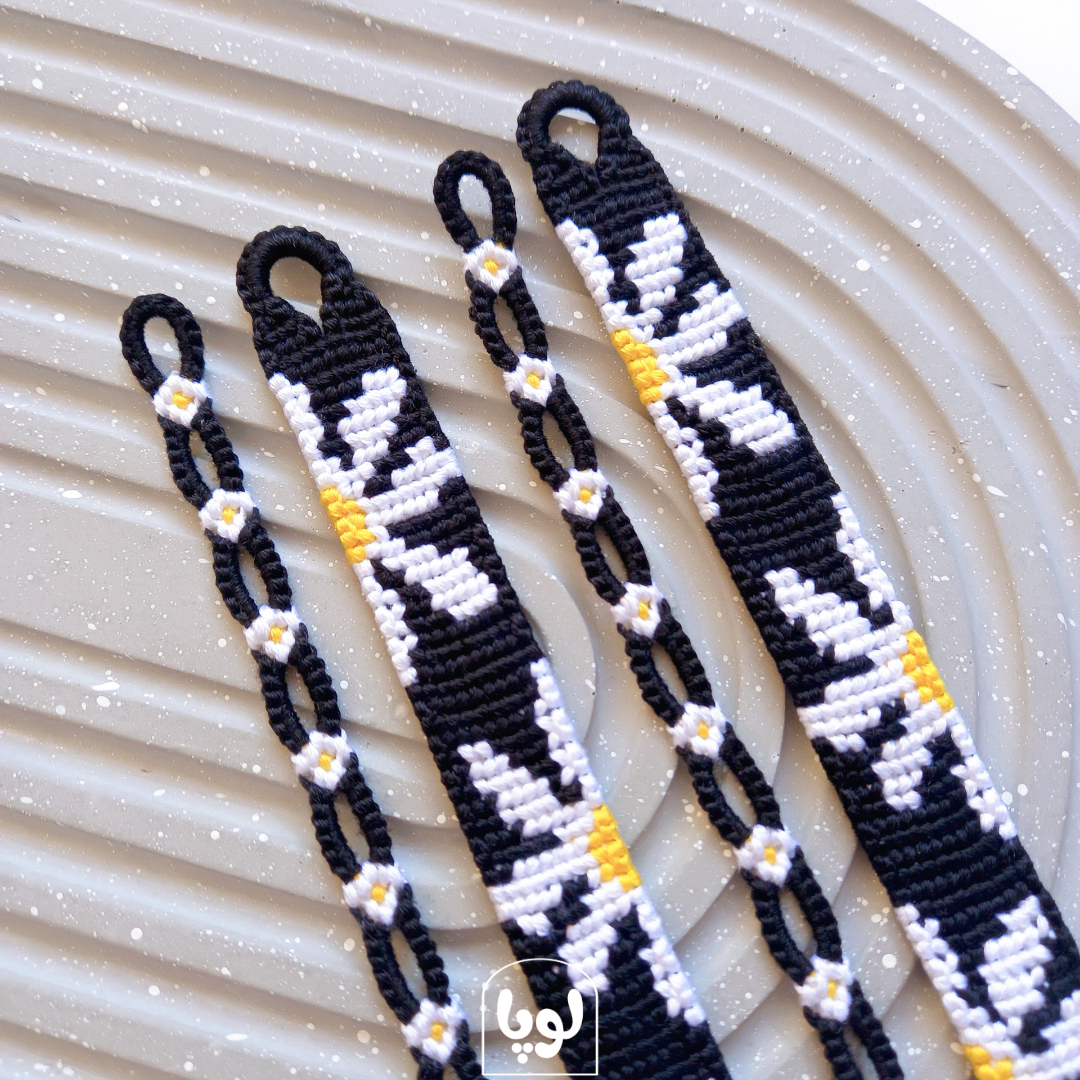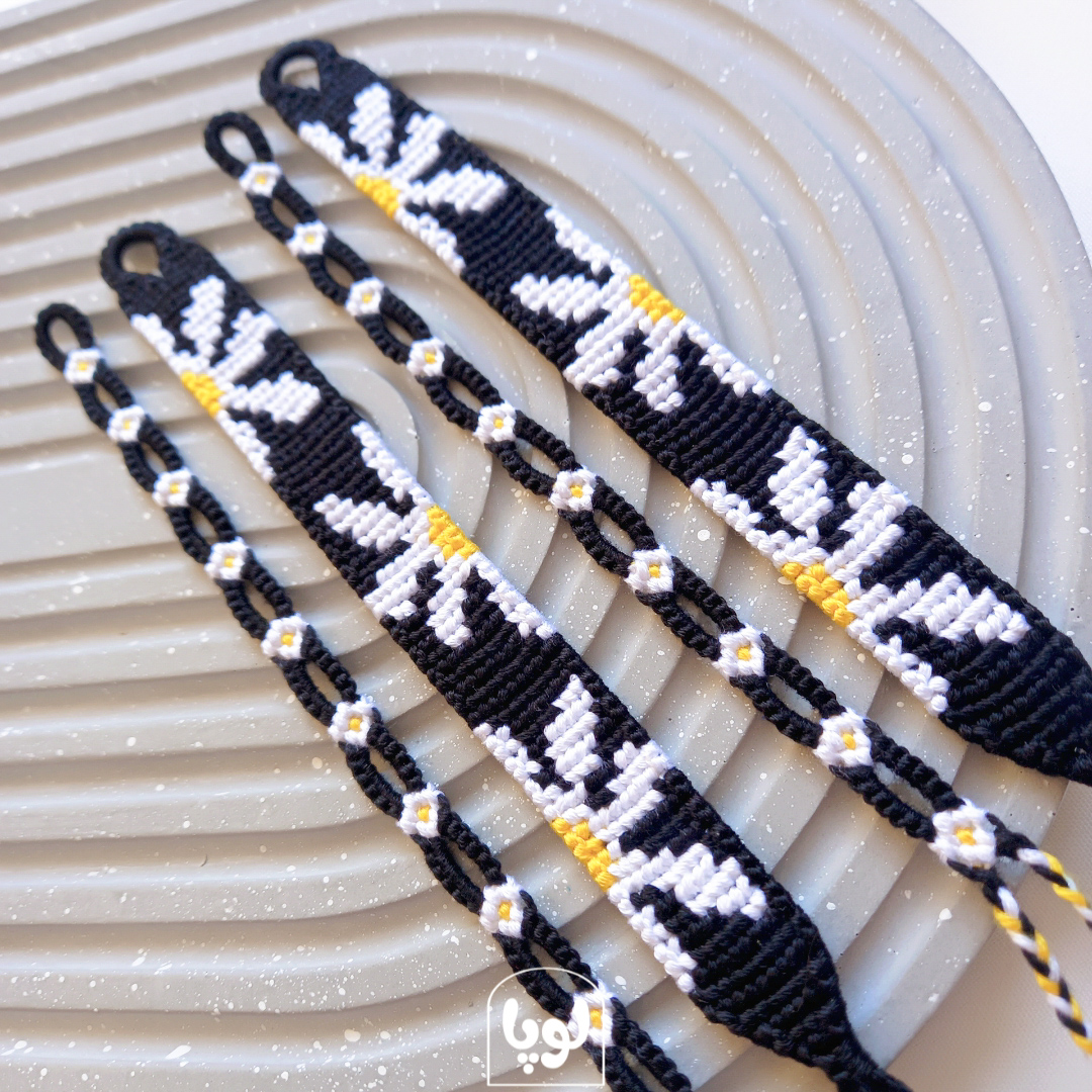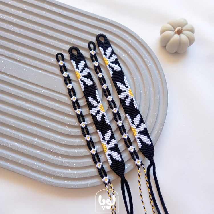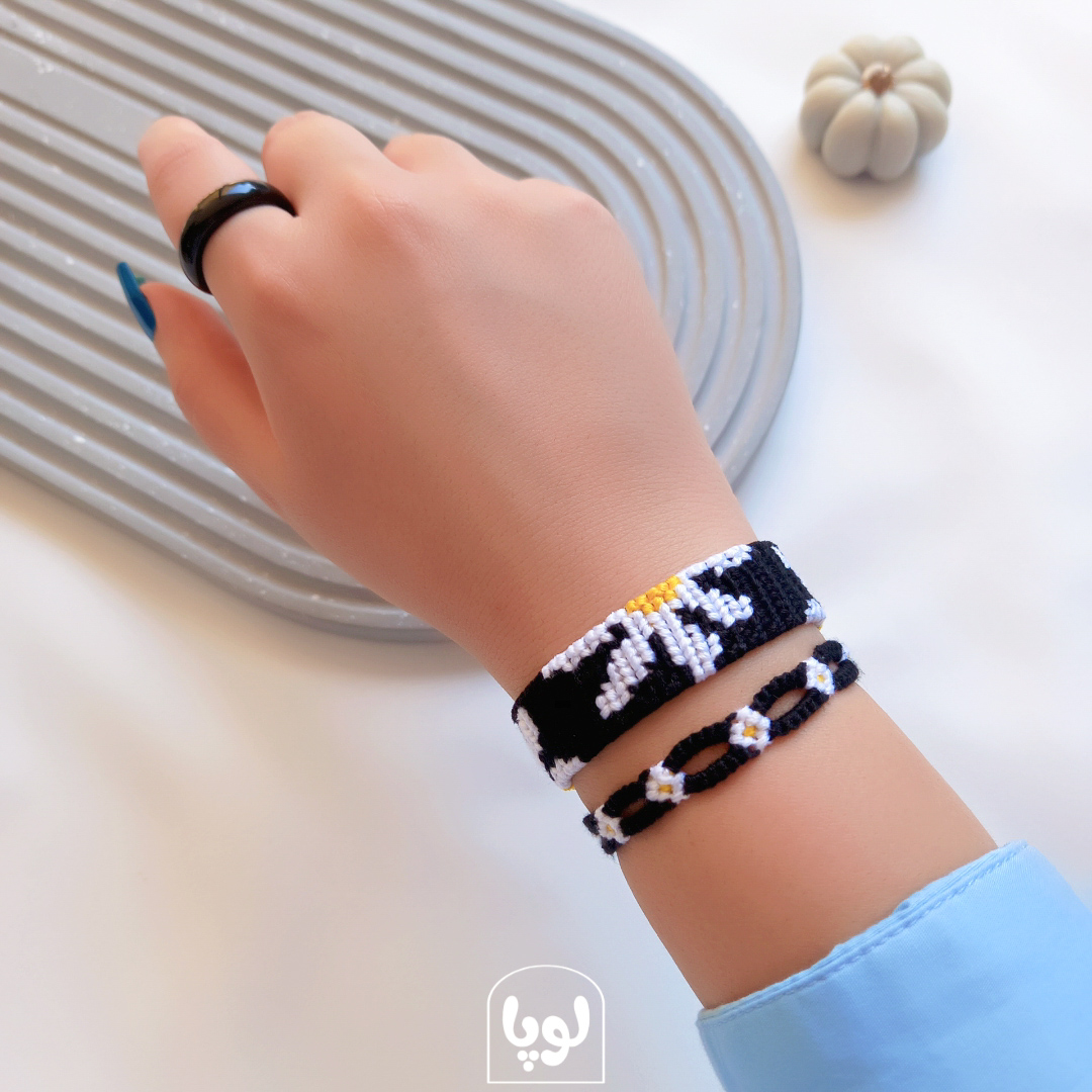 این دستبند بافته شده با عشق، از گلهای بابونهی مینیاتوری بر روی زمینهی مشکی، جلوهای منحصربهفرد به دستان شما میبخشد. هر گل، داستانی از آرامش و زیبایی را روایت میکند و رنگ مشکی، عمق و وقار را به طرح اضافه مینماید.